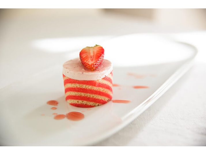 Cremoso alla polpa di fragole in un biscuit morbido alla mandorla.