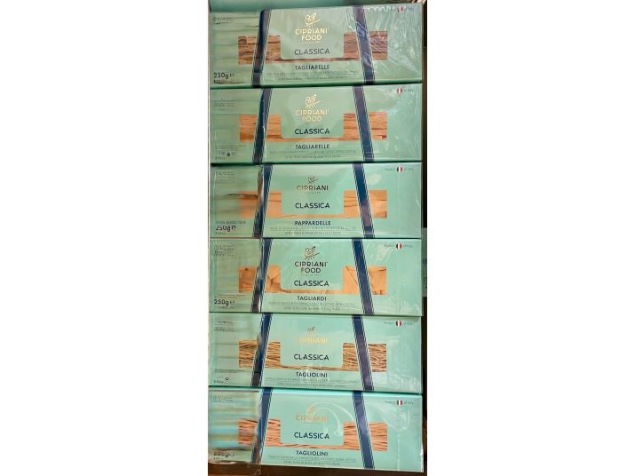 Prodotti esclusivamente presso le strutture di Cipriani a Venezia. Semola di Grano Duro. Scegli tra (indicare nelle note): Tagliarelle con spinaci, Tagliarelle, Pappardelle, Tagliardi, Tagliolini, Tagliolini con spinaci. Confezione da 250 gr.
