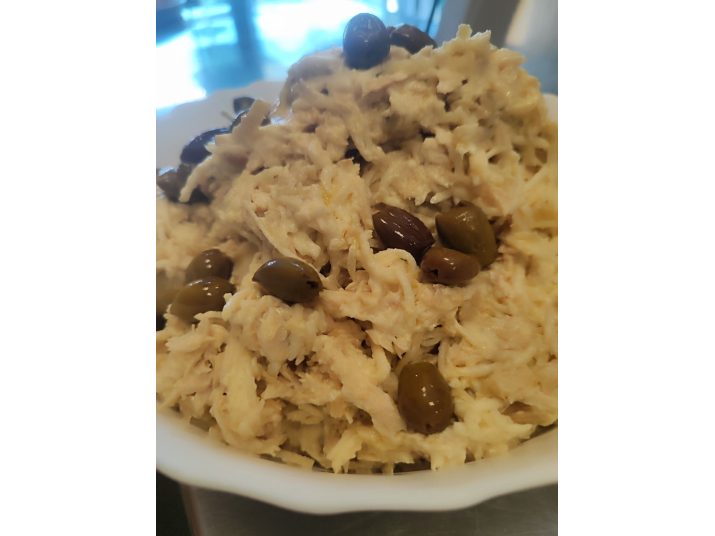 (VERSIONE1)Un’insalata fresca, leggera ma sostanziosa con pollo arrostito tagliato sottilissimo e sedano rapa a julienne, condita con yogurt magro, una punta di maionese ed un po’ di senape. Sopra olive taggiasche denocciolate.