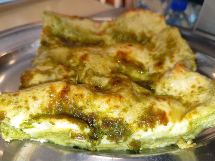Ricche e profumatissime lasagne condite con besciamella, pesto genovese e grana padano DOP, cotte al forno con leggera gratinatura.