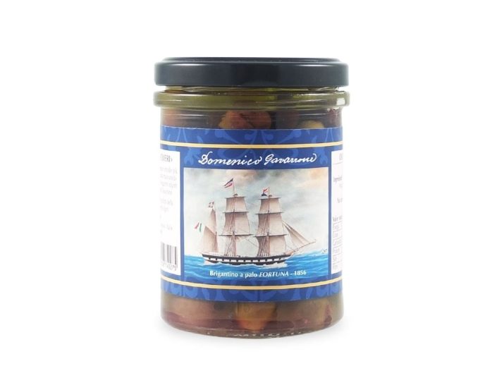 Oliva Taggiasca snocciolata e messa sott’olio, accompagnata da erbe aromatiche.